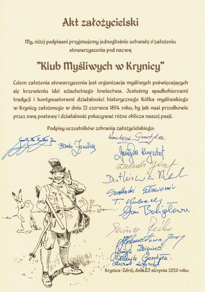 23 sierpnia 2020 roku po 126 latach ponownie kilku pasjonatów – myśliwych spotkało się, aby założyć stowarzyszenie Klub Myśliwych w Krynicy. Zakładając stowarzyszenie będziemy chcieli pokazywać różne oblicza naszej pasji.